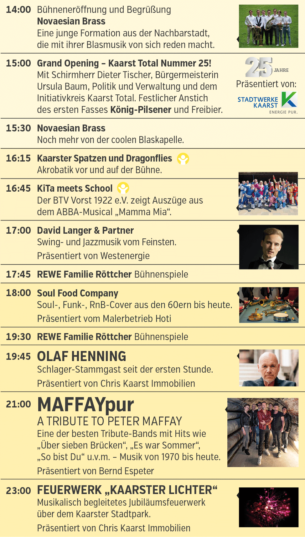 Den aktuellen Flyer mit dem Bühnenprogramm und vielen Infos finden Sie ab sofort in vielen Kaarster Geschäften und an den meisten Bühnen und Ständen bei Kaarst Total.